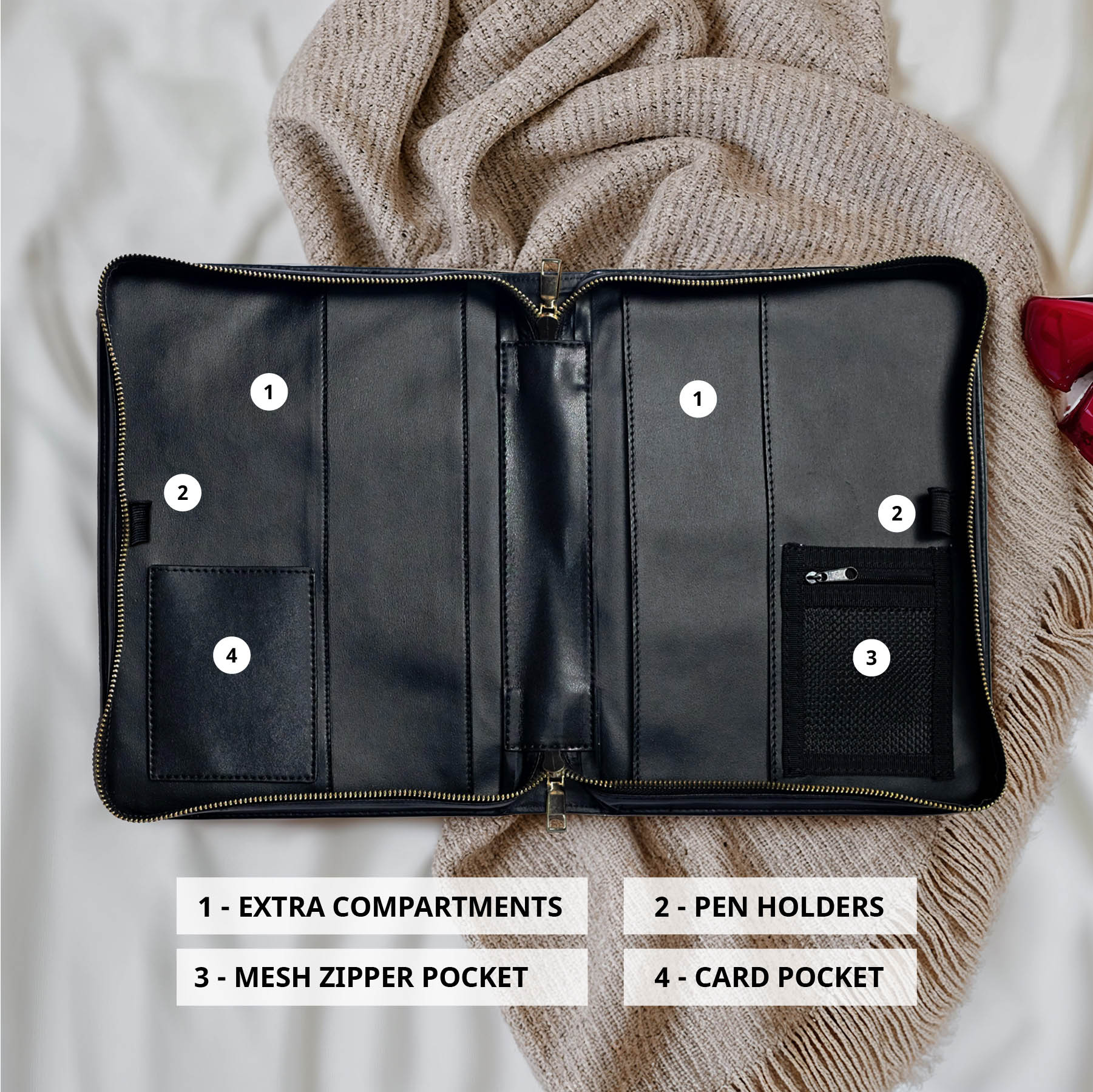 Inside, you’ll find extra compartments for sermon notes, dual pen holders, a mesh zipper pocket for small items, and a card pocket. Thoughtfully designed to protect what matters most.