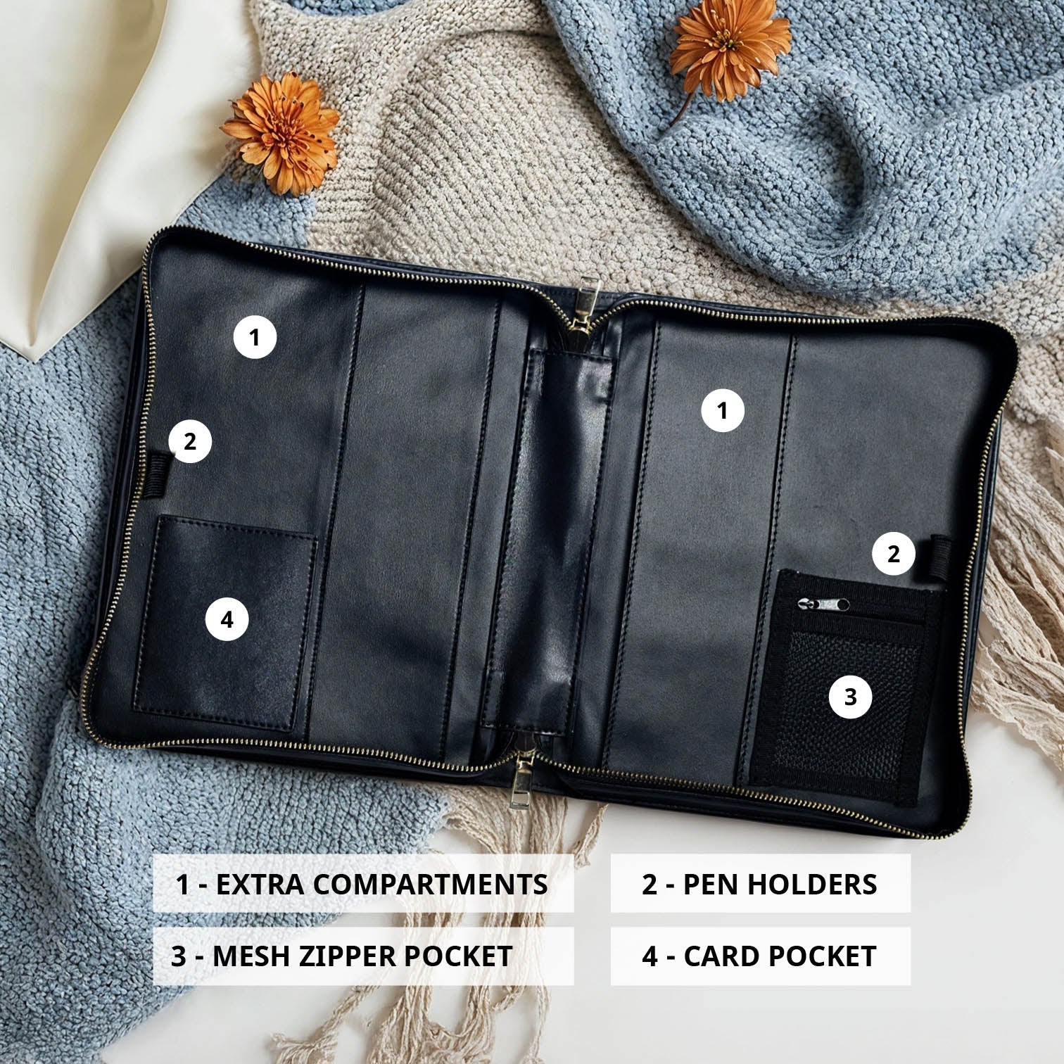 Inside, you’ll find extra compartments for sermon notes, dual pen holders, a mesh zipper pocket for small items, and a card pocket. Thoughtfully designed to protect what matters most.