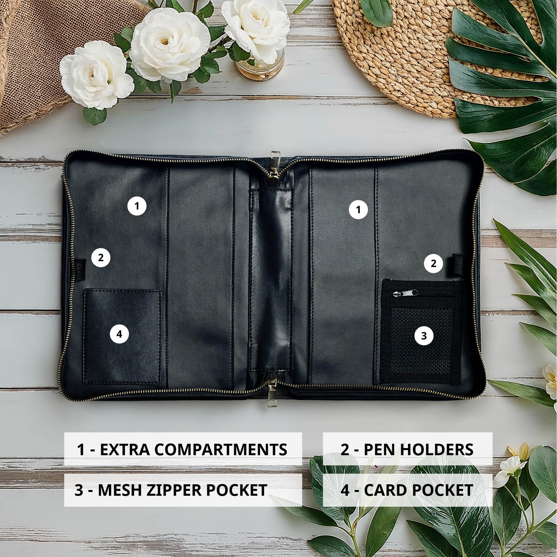 Inside, you’ll find extra compartments for sermon notes, dual pen holders, a mesh zipper pocket for small items, and a card pocket. Thoughtfully designed to protect what matters most.