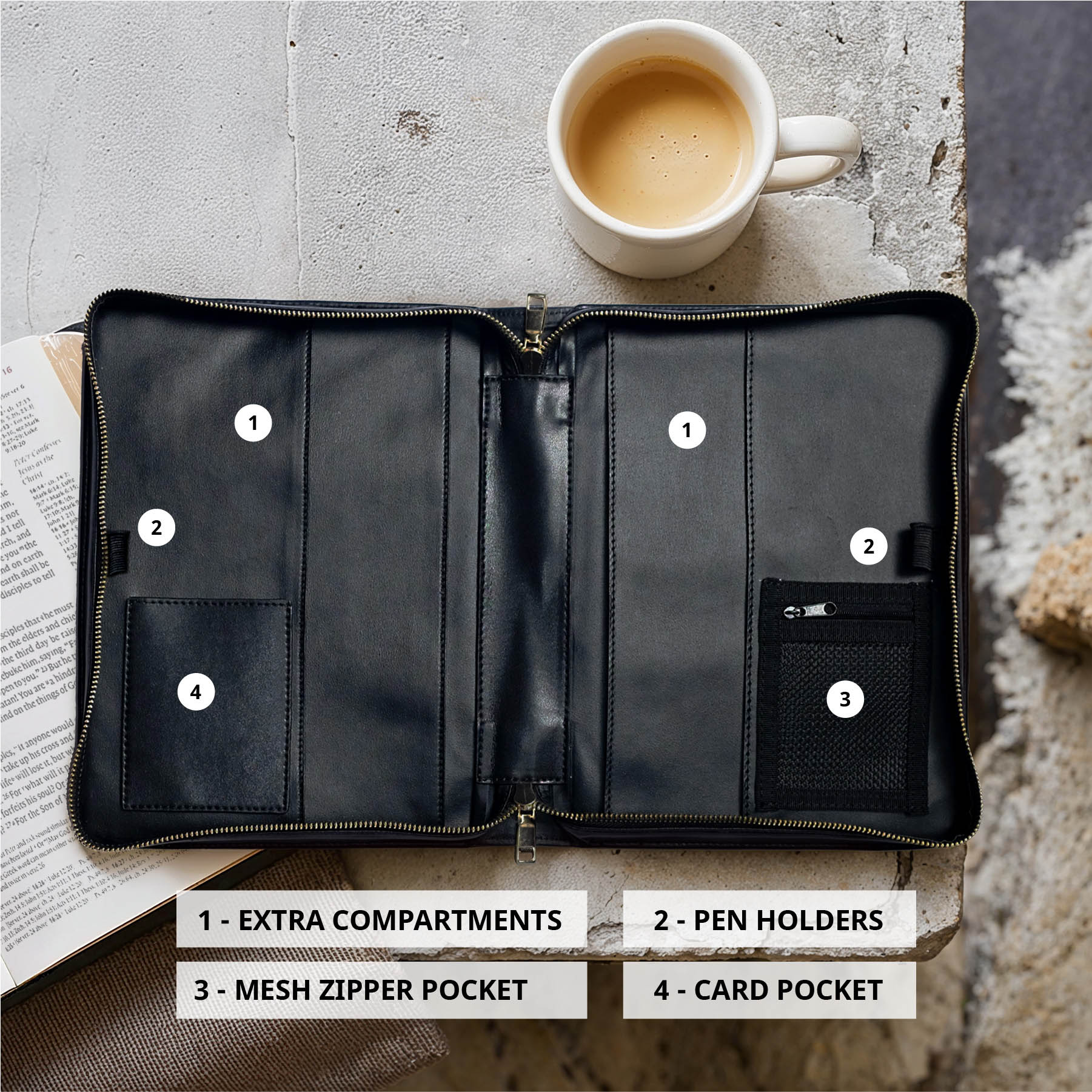 Inside, you’ll find extra compartments for sermon notes, dual pen holders, a mesh zipper pocket for small items, and a card pocket. Thoughtfully designed to protect what matters most.