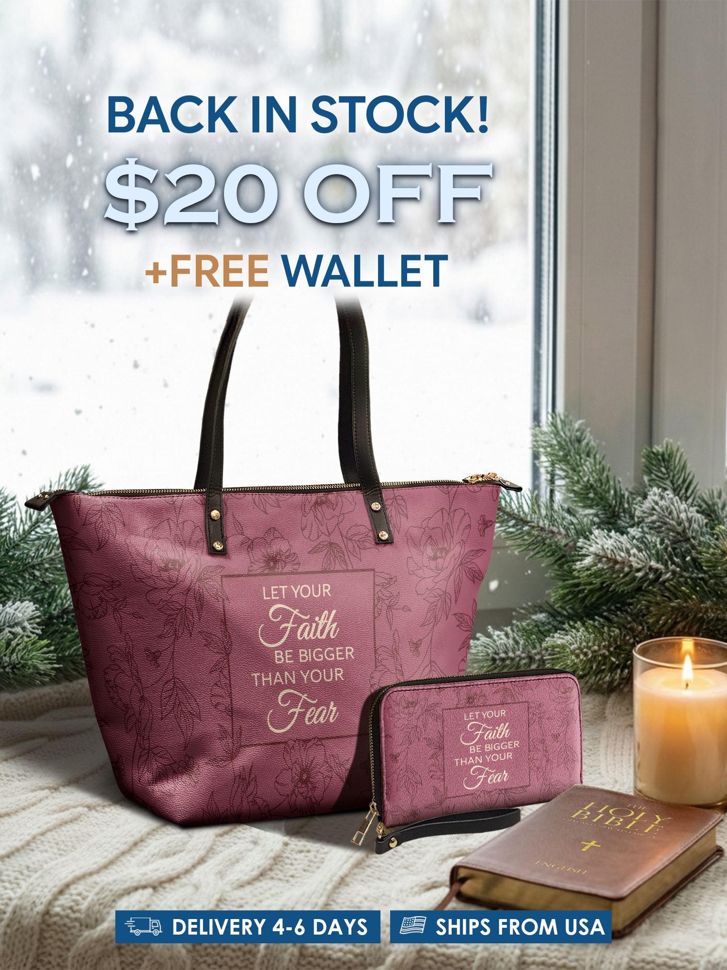 This tote bag is spacious and practical, easily fitting 3 large print Bibles, a 13" laptop, books, and daily must-haves.