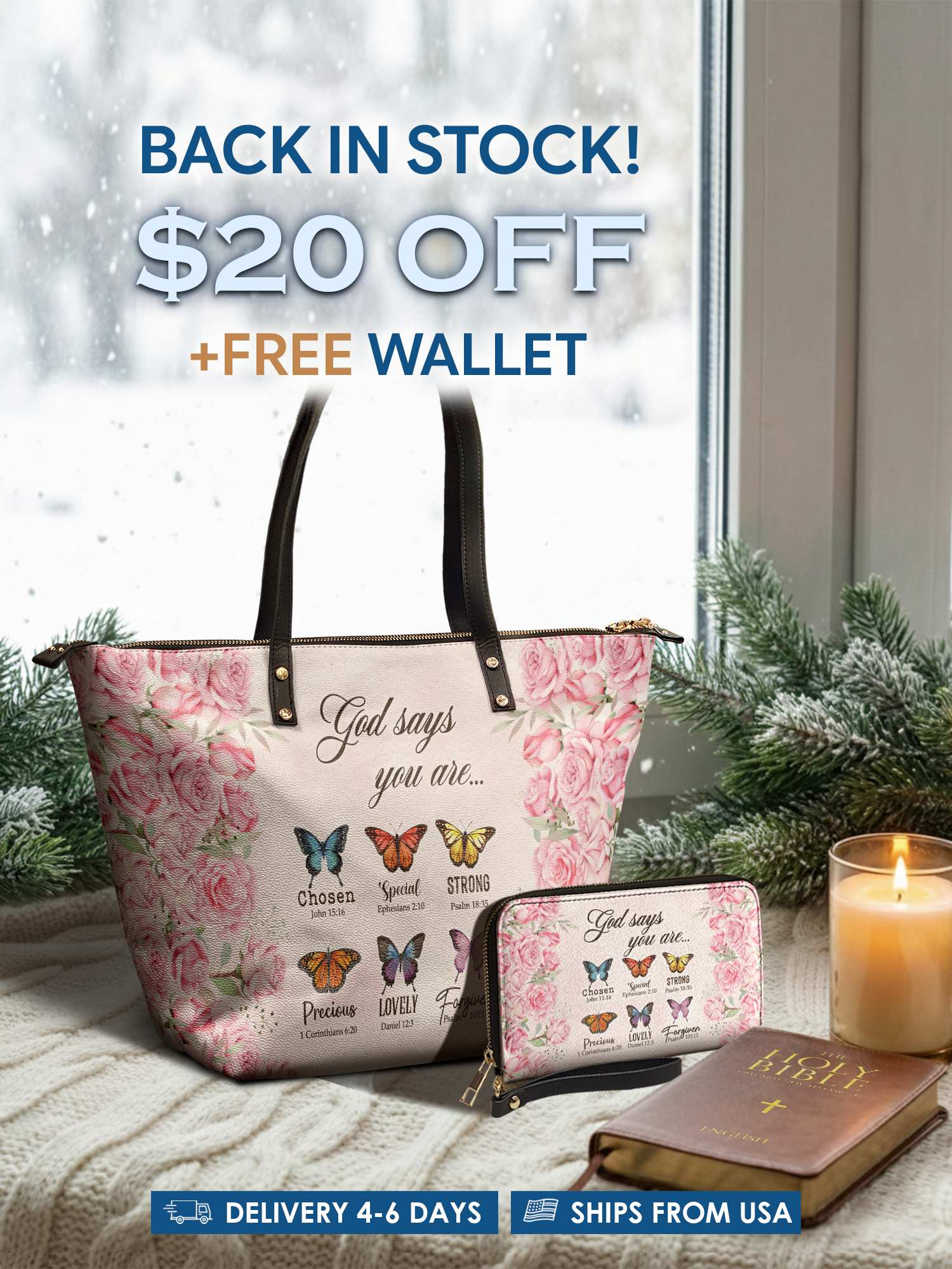 This tote bag is spacious and practical, easily fitting 3 large print Bibles, a 13" laptop, books, and daily must-haves.