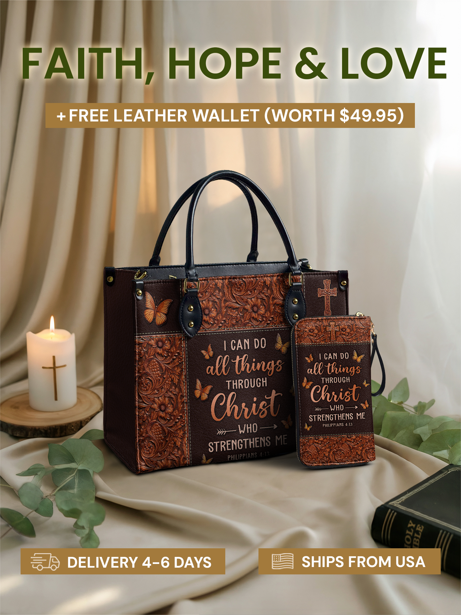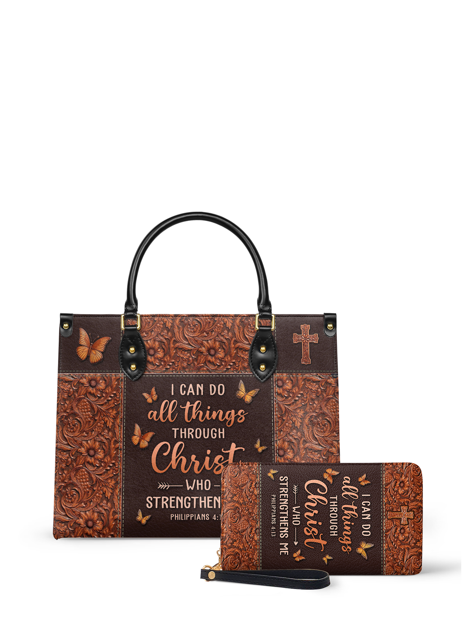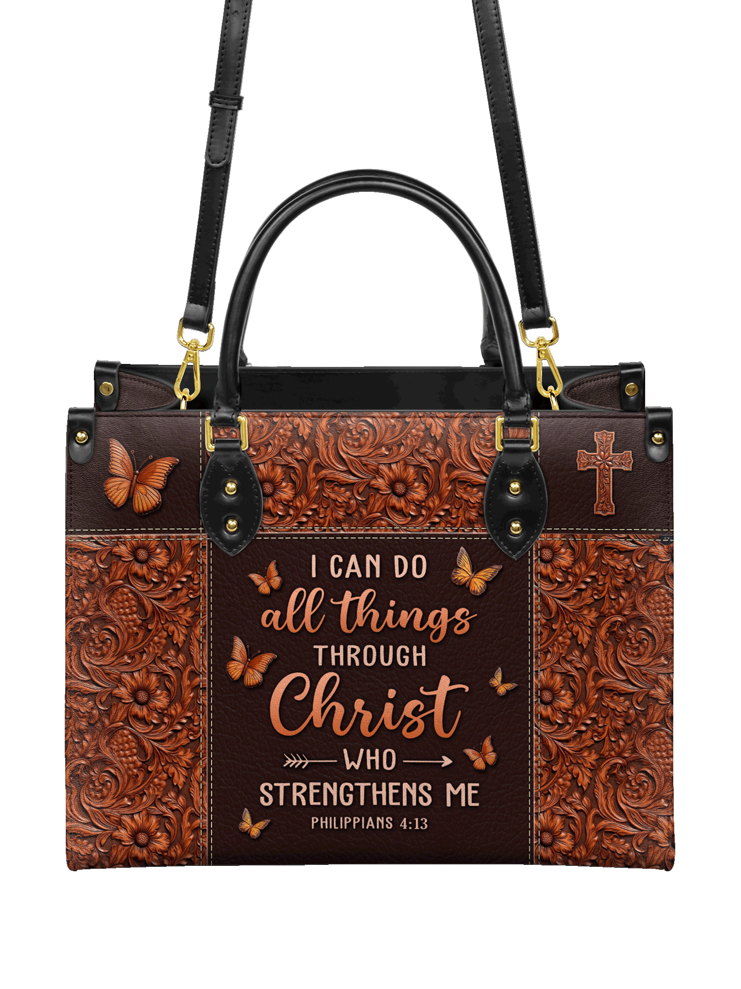 Inspired by Philippians 4:13, it serves as a reminder that with Christ, all things are possible. The rich leather detailing and timeless design embody quality craftsmanship, making it a graceful expression of faith and confidence in God’s power.