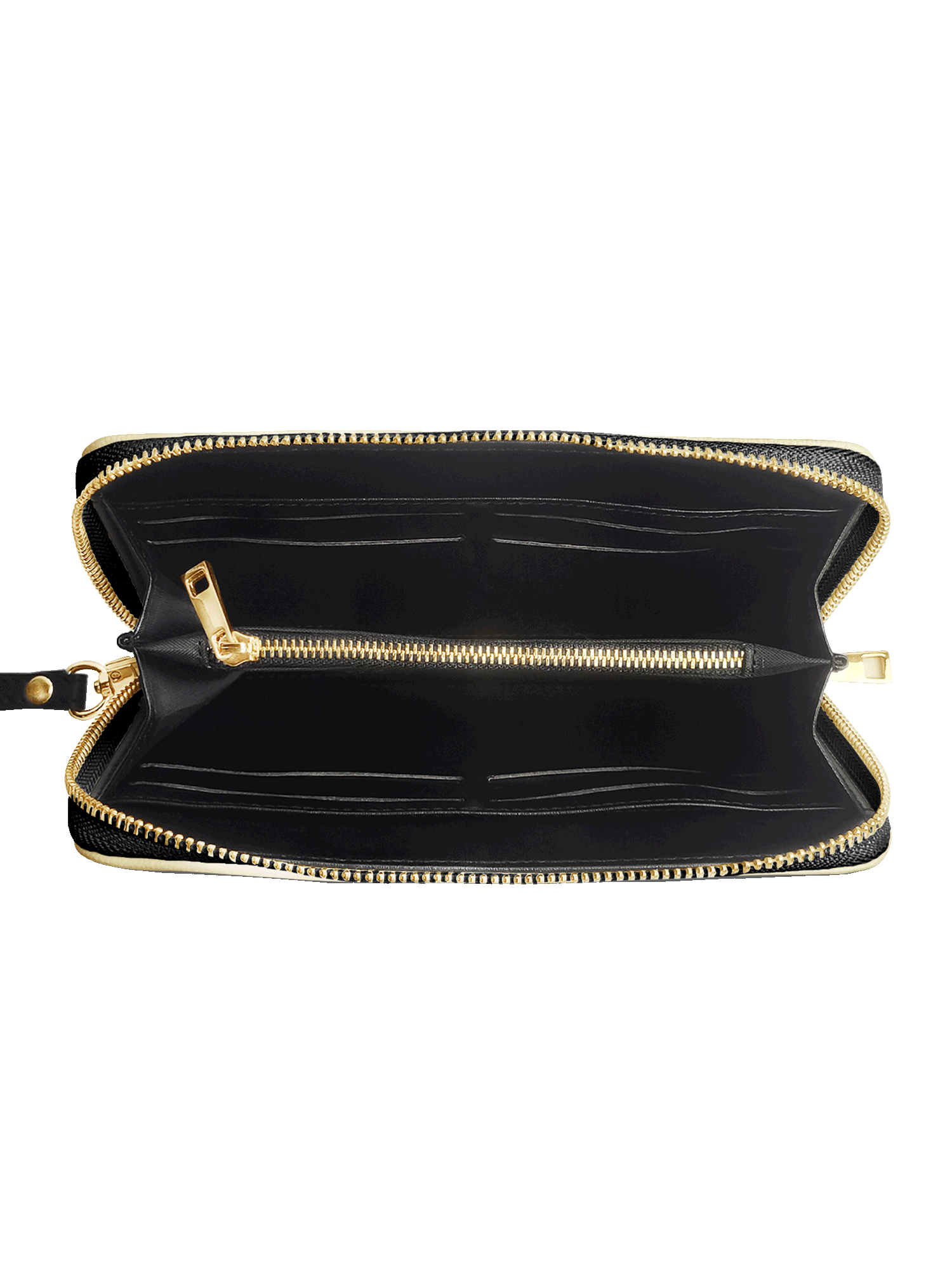 This wallet is spacious and stylish, holding beauty essentials, cash, cards, and a phone with ease.