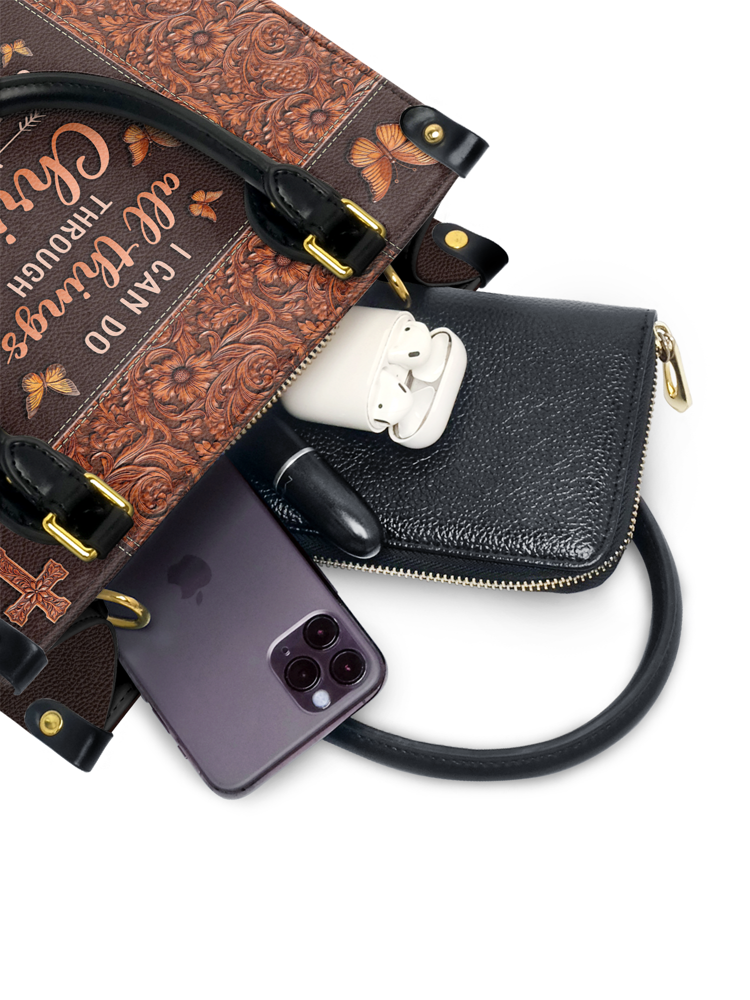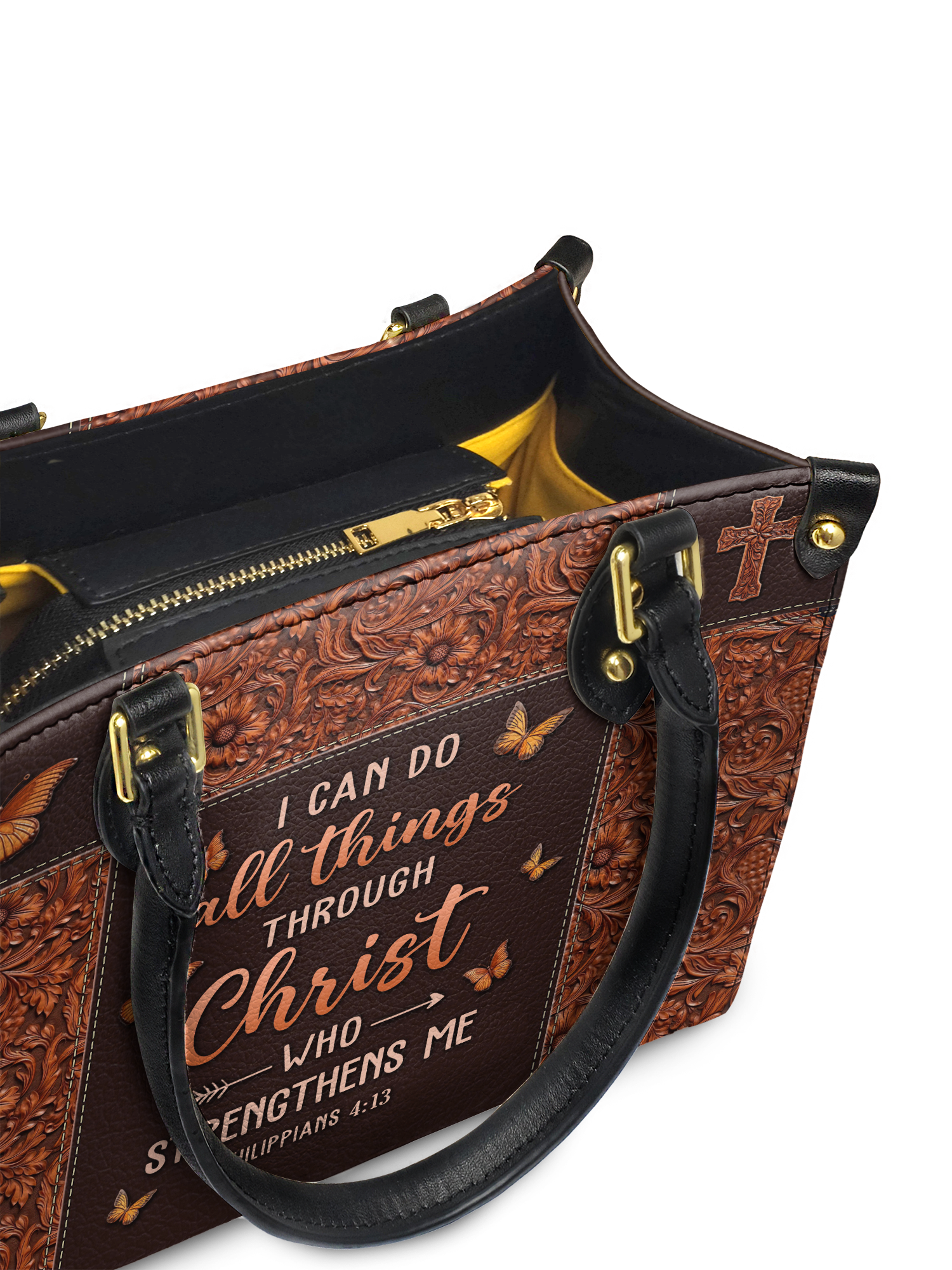 This handbag is spacious yet stylish, fitting up to 3 Bibles, a 14" laptop, books, wallet, and more.