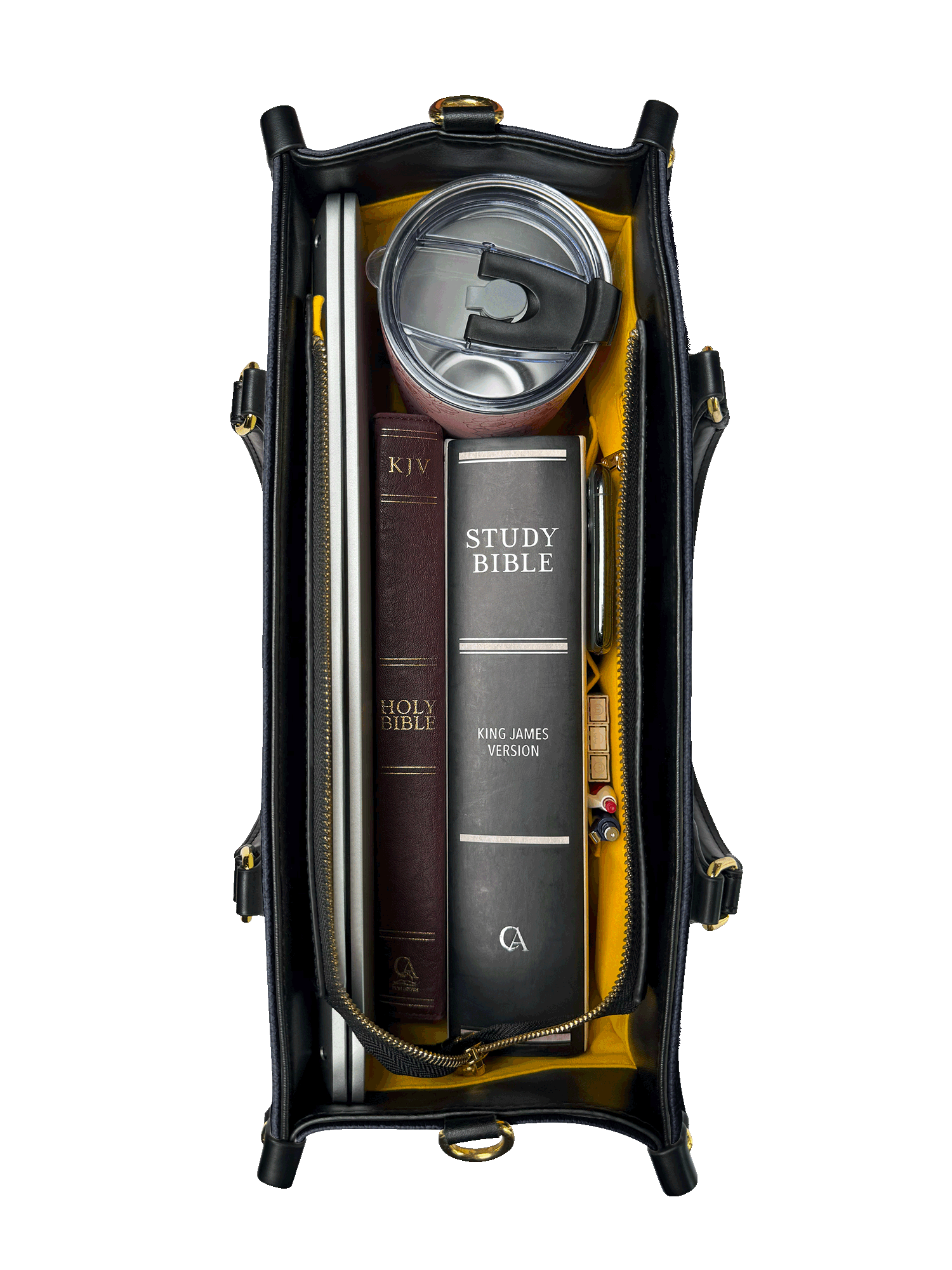This handbag is spacious yet stylish, fitting up to 3 Bibles, a 13" laptop, books, wallet, and more.