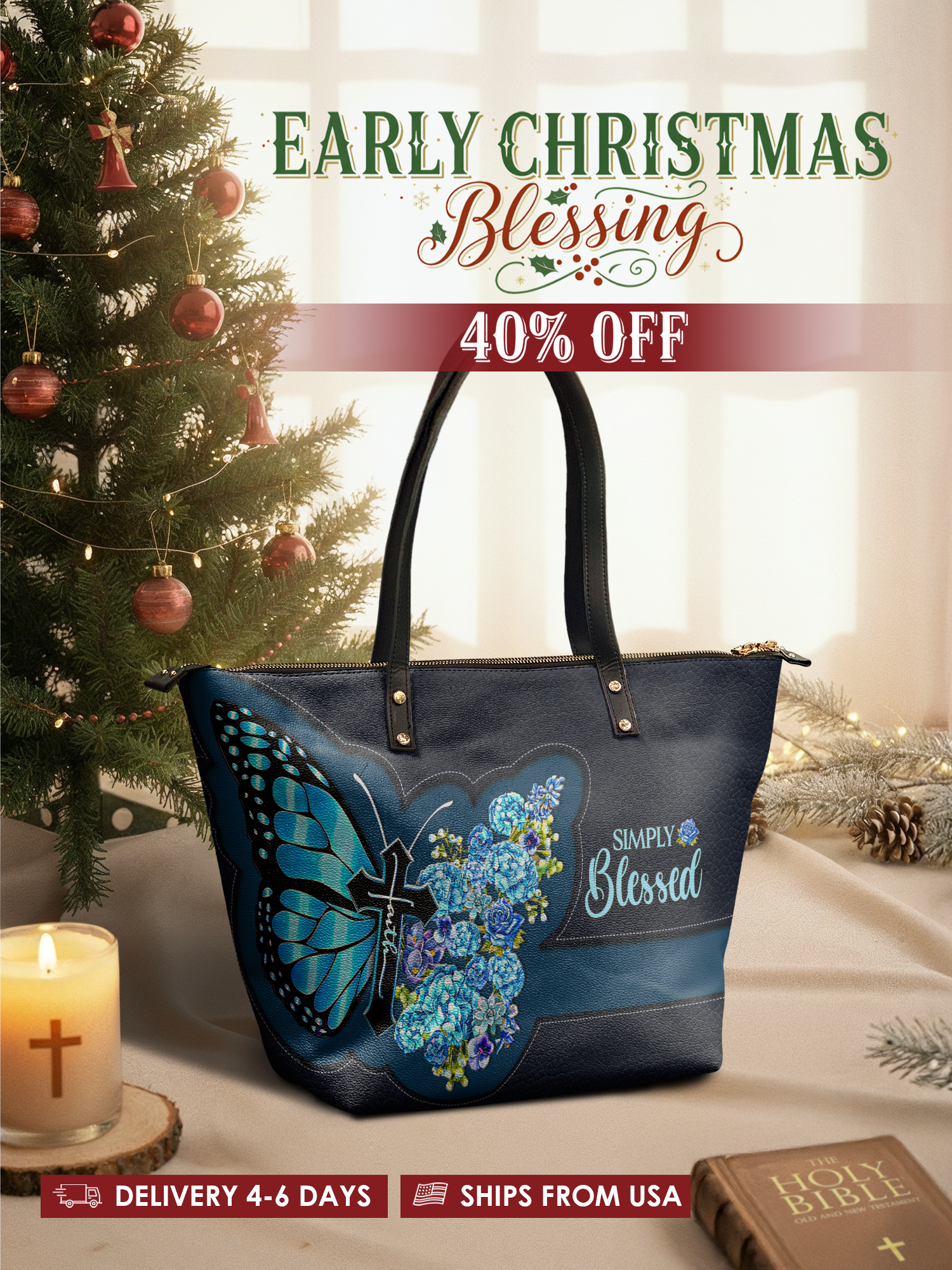 This tote bag is spacious and practical, easily fitting 2 large print Bibles, a 13" laptop, books, and daily must-haves.