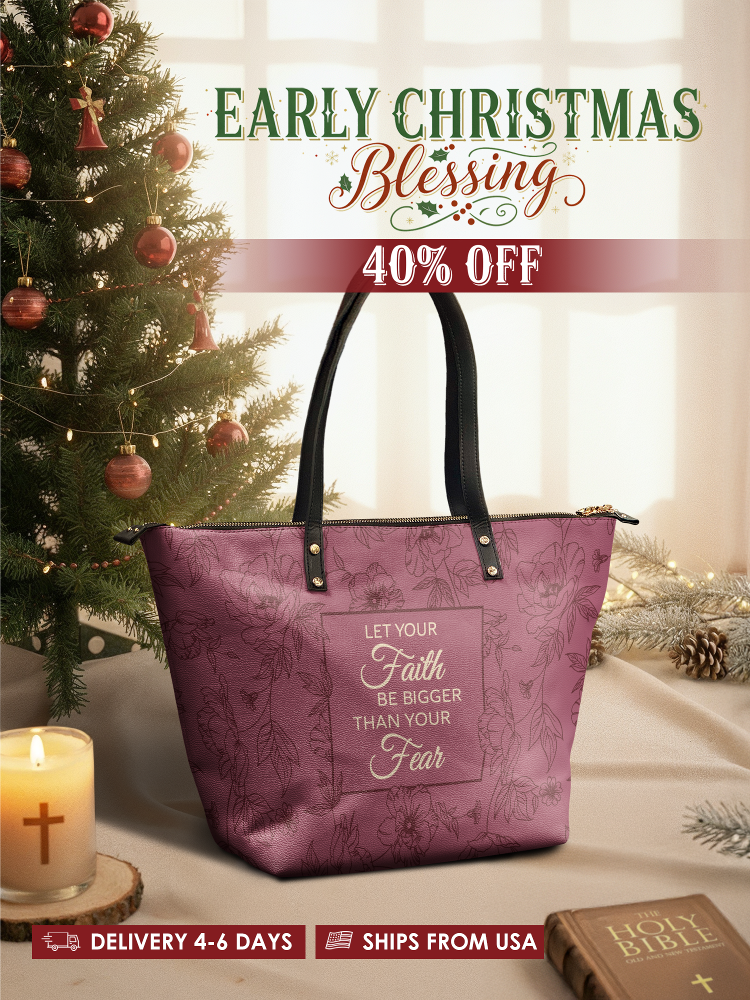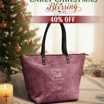 This tote bag is spacious and practical, easily fitting 2 large print Bibles, a 13" laptop, books, and daily must-haves.