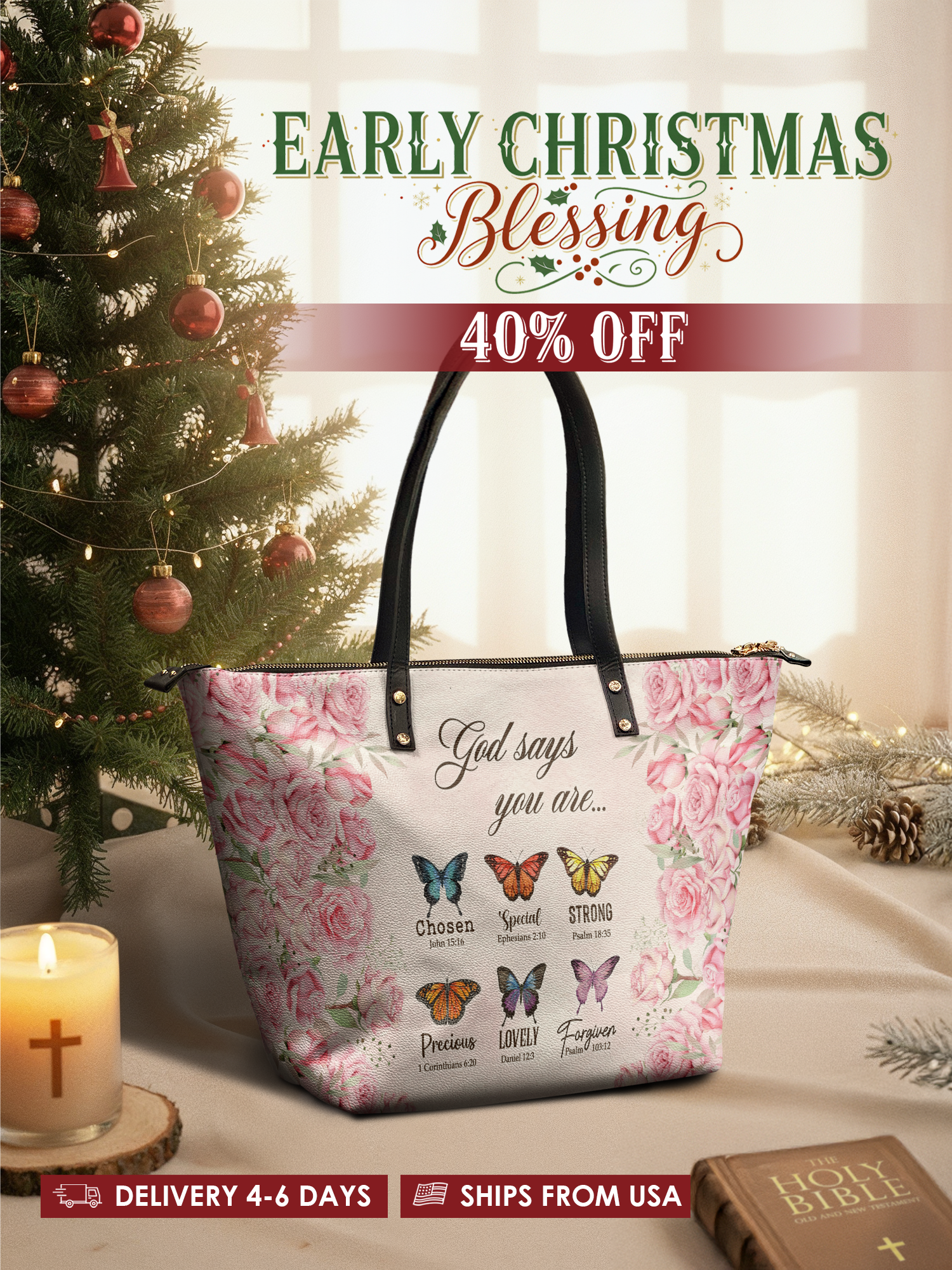 This tote bag is spacious and practical, easily fitting 2 large print Bibles, a 13" laptop, books, and daily must-haves.
