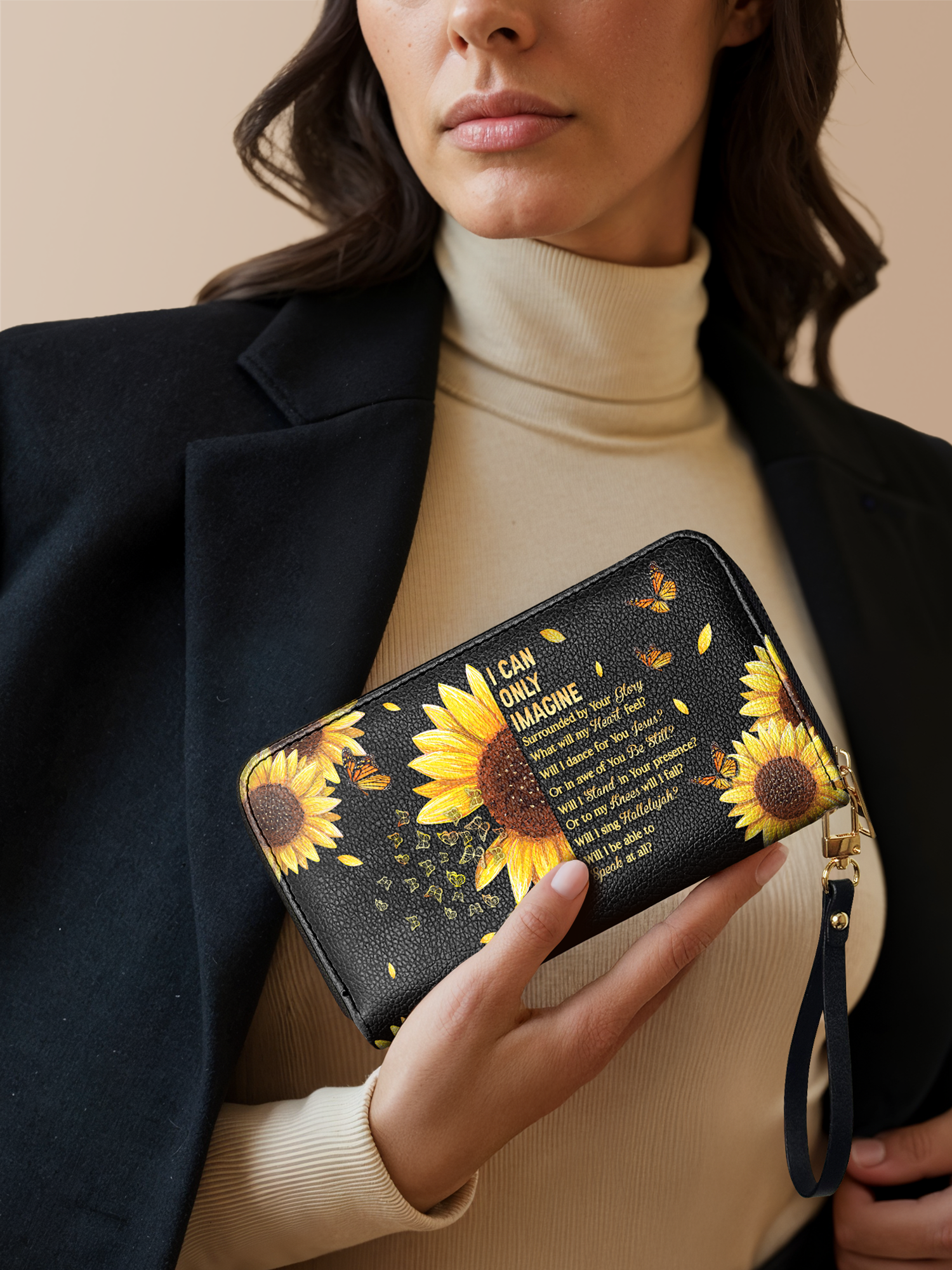 The secure zipper closure keeps everything safe, while the detachable wrist strap offers effortless carrying—perfect for work, travel, or a chic night out.