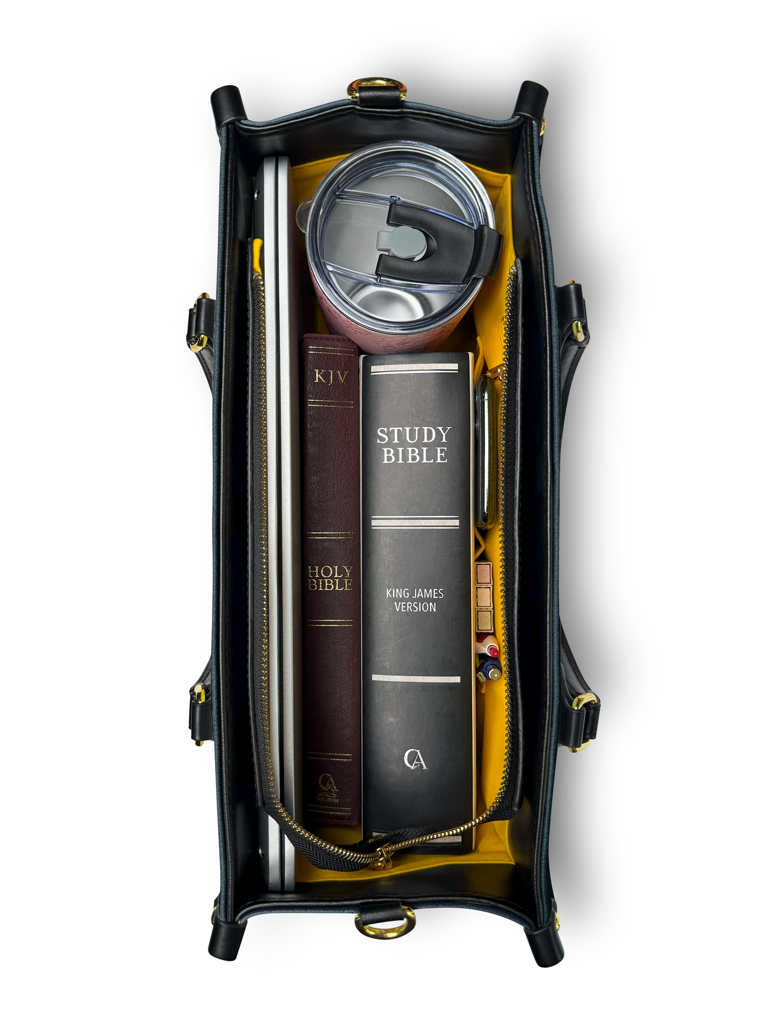 Fits up to 3 Bibles, a 14" laptop, books, wallets, and more