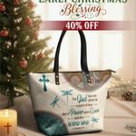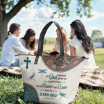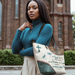 This tote bag is spacious and practical, easily fitting 2 large print Bibles, a 13" laptop, books, and daily must-haves.