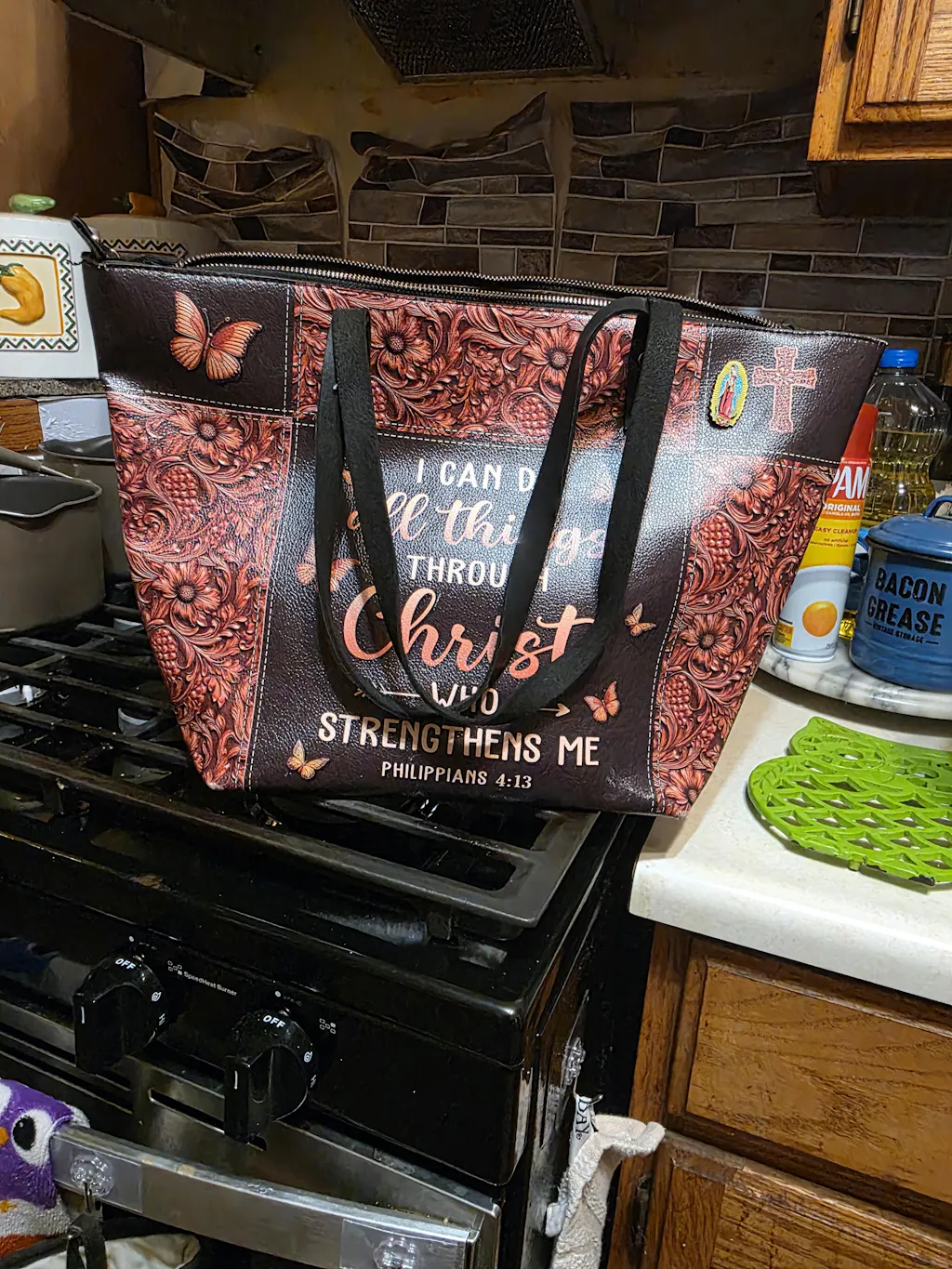 This handbag is spacious yet stylish, fitting up to 3 Bibles, a 14" laptop, books, wallet, and more.