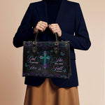 I just love my new bag! The vegan leather is very soft and pliable, which I love! I have already used my bag for Bible study and will also be using it on Sunday's for my GriefShare class. I am able to fit all my materials for both applications which gives me a comfortable & beautiful way to share my faith with others. I will love carrying a special verse on my bag that God gave me from Psalm 46 while walking a painful journey of grief. "Be still and know that I am God." He had some very special things to share with me when I got still in His presence.