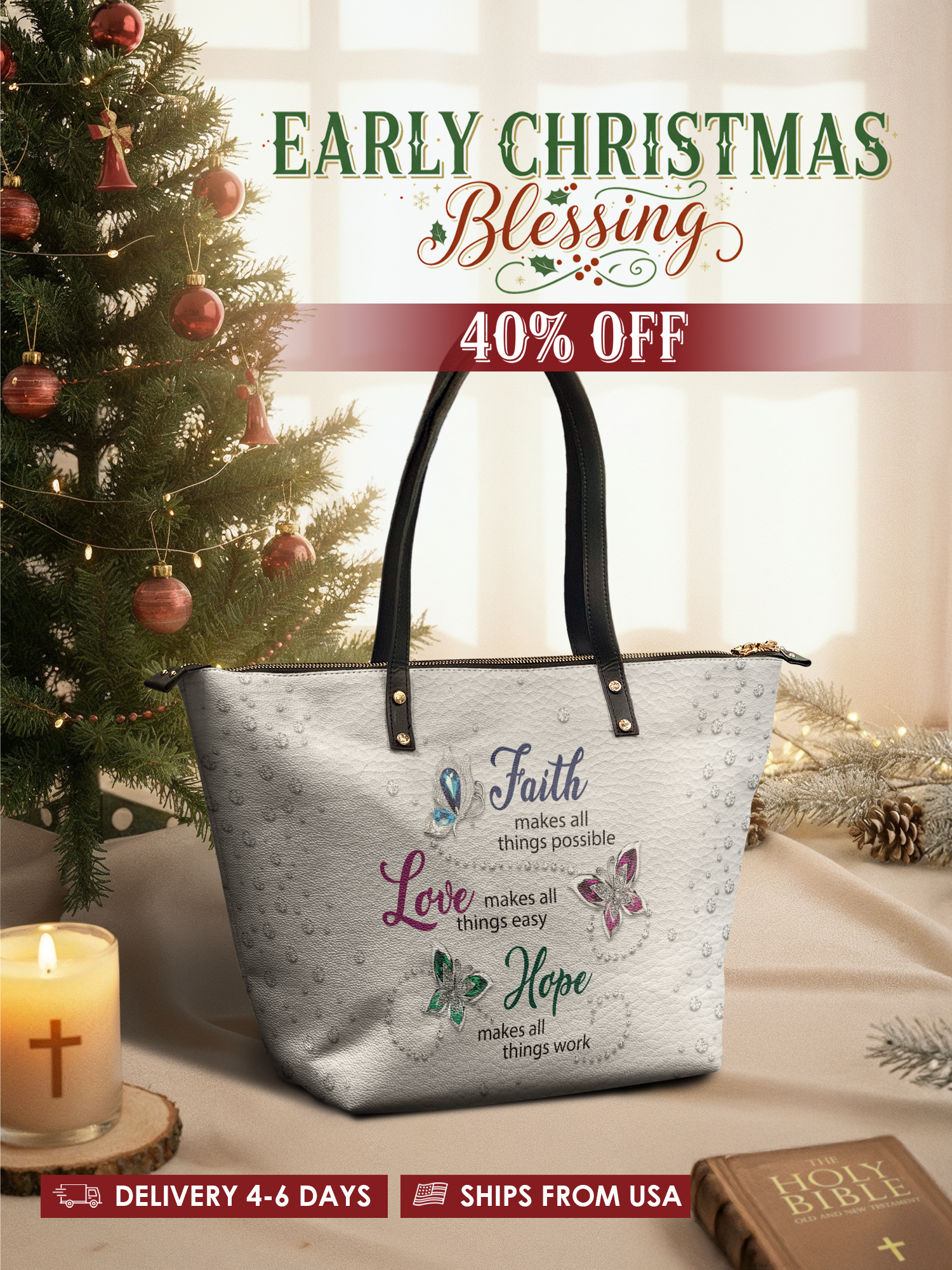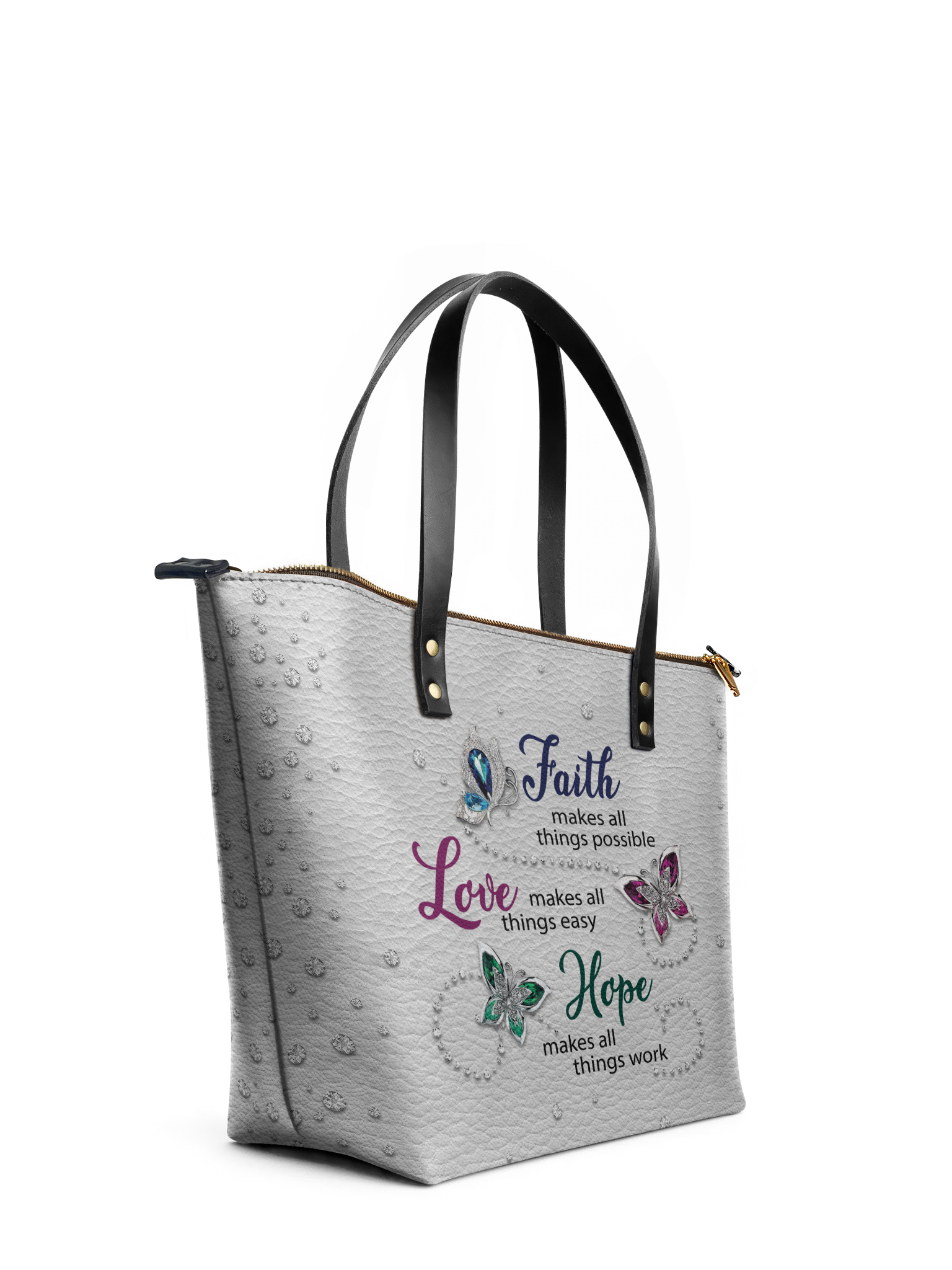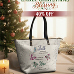 This tote bag is spacious and practical, easily fitting 2 large print Bibles, a 13" laptop, books, and daily must-haves.