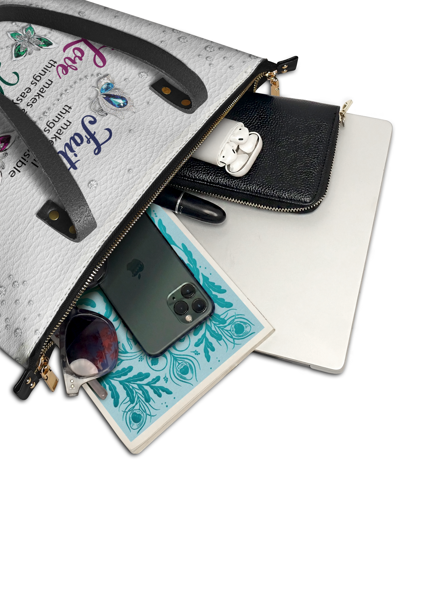 I just love my new bag! The vegan leather is very soft and pliable, which I love! I have already used my bag for Bible study and will also be using it on Sunday's for my GriefShare class. I am able to fit all my materials for both applications which gives me a comfortable & beautiful way to share my faith with others. I will love carrying a special verse on my bag that God gave me from Psalm 46 while walking a painful journey of grief. "Be still and know that I am God." He had some very special things to share with me when I got still in His presence.